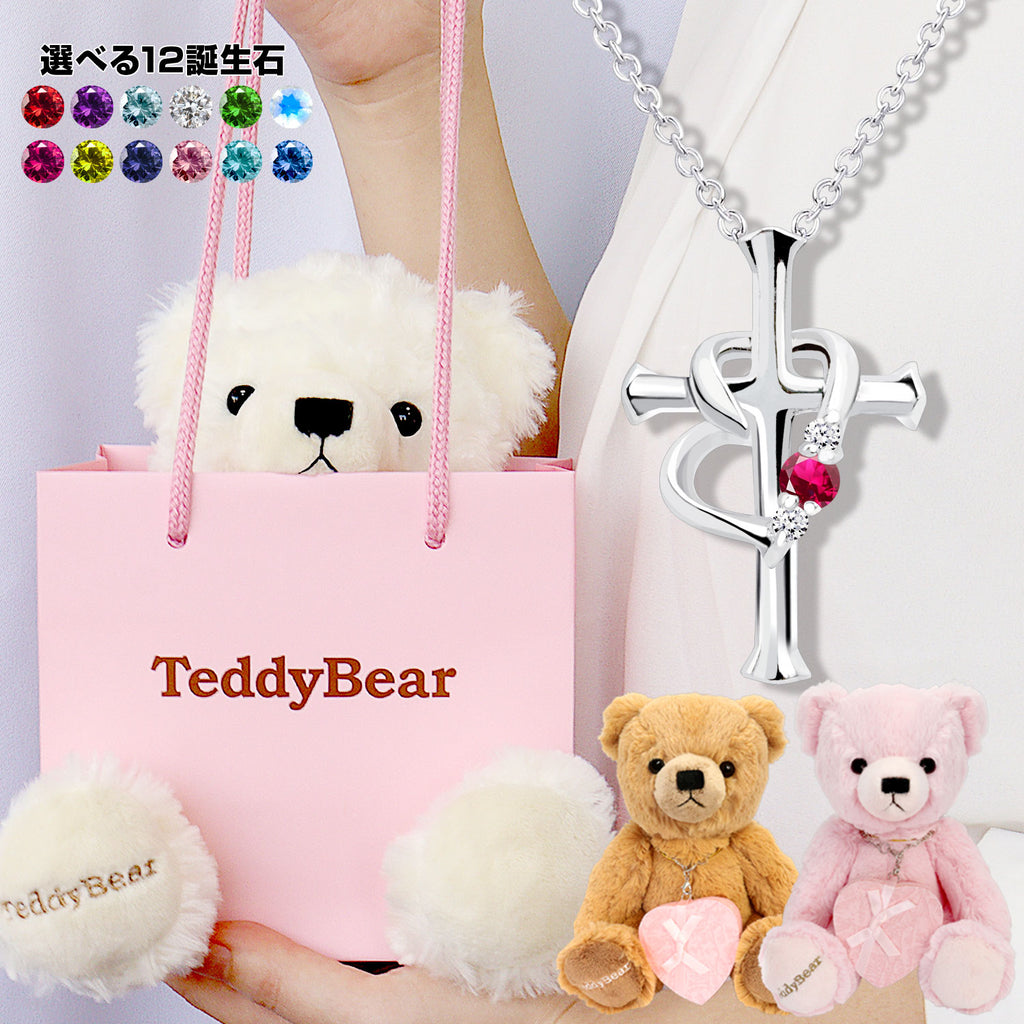 ネックレス レディース テディベア ぬいぐるみ付 クロス ハート 十字架 ダイヤ 誕生石 p5257-tdt-01